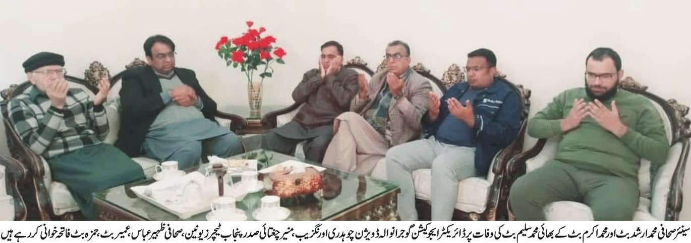 گجرات (نمائندہ خصوصی) سینئر صحافی محمد ارشد بٹ اور محمد اکرم بٹ کے بڑے بھائی، طیب بٹ، حسیب بٹ کے والد محترم جو وفات پا گئے تھے ان کا ختم دسواں اور ختم چہلم ان کی رہائشگاہ کڑیانوالہ میں ہوا، جس میں ممتاز عالم دین محمدسرور لون نے فلسفہ موت و حیات پر مفصل روشنی ڈالی، ختم دسواں و چہلم کی محفل میں کڑیانوالہ کی ممتاز سیاسی سماجی و مذہبی شخصیات نے شرکت کی، شرکت کرنے والوں میں سابقہ چیئر مین ہارون بٹ، ڈاکٹر خواجہ طاہر محمود،ڈاکٹر مزمل مقدس،محمد اشرف بٹ، باؤ تصدق منیر، راجہ سعادت اسماعیل، چوہدری محمد اصغرمہر، اویس بٹ، دانیال بٹ، عنایت اللہ بٹ، فاروق شاہد بٹ،عبد الرزاق  قادری، اظہر میر، اقبال بٹ، ڈاکٹر خواجہ طاہر محمود، فہیم بٹ، محمد علی جسرا، فیاض بٹ سابقہ کونسلر، چوہدری شاہنواز، خواجہ عقیل، خواجہ عثمان، حمزہ بٹ،مبین بٹ، زاہد بٹ،  صحافی سیٹھ منظور احمد،صحافی ڈاکٹر امجد چوہدری،عمیر بٹ،خرم بٹ، اسحاق بٹ،بنک منیجر علی بٹ، مشتاق بٹ، فیاض بٹ، خادم حسین بٹ، محمد اسلم بٹ، کشان بٹ، عظیم بٹ،خالد بٹ، خرم بٹ، سفیان بٹ، بابر بٹ، ایوب بٹ، امتیاز سرور بٹ، حسنین بٹ، حسنین اشرف بٹ، ثقلین اشرف بٹ،سیٹھ علی منظور، مکرم بٹ، حامد بٹ، حسن بٹ، چوہدری وہاب ان کے علاوہ علاقہ کی ممتاز مذہبی و سیاسی سماجی شخصیات بھی شریک ہوئے